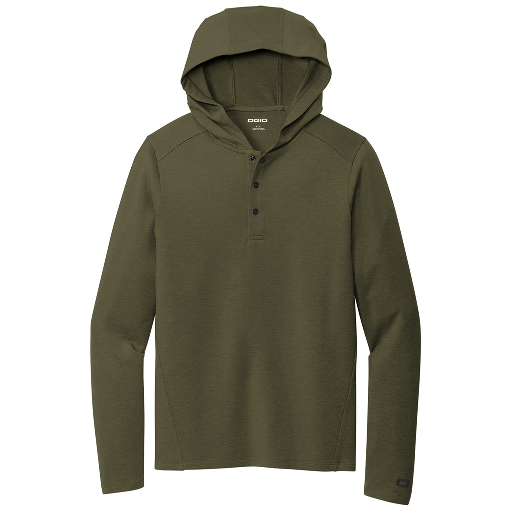 The company logo OGIO Men's Deep Olive Luuma Flex Hooded Henley offers style and comfort in one. Add your company name to the henley in embroidery and you have an easy way to advertise your brand. This product makes an excellent new employee welcome gift.