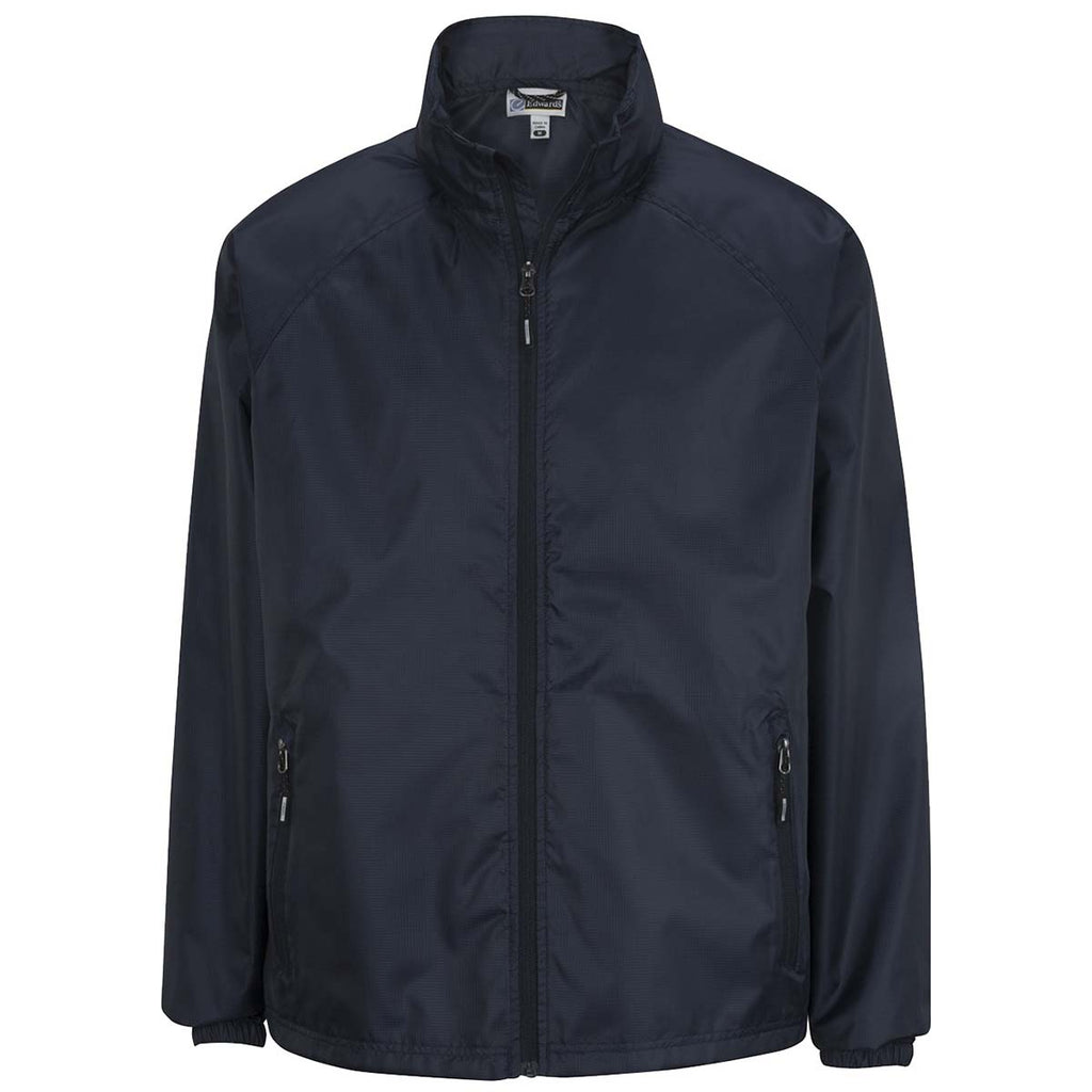 The rainy weather is no match for a custom Edwards Men's Navy Hooded Rain Jacket made of 100% ripstop nylon in five classic colors. The versatile, lightweight rain jacket is waterproof with a fully seam sealed interior for those sudden storms. Add a corporate embroidery to use this as an additional piece of employee apparel or a company logo to add to the corporate uniform when the weather turns nasty. The look is completed with elastic cuffs, draw cord, and zippered pockets to keep everything dry and secure. This rain jacket even folds into its own zippered pouch for easy storage when needed.Highlights