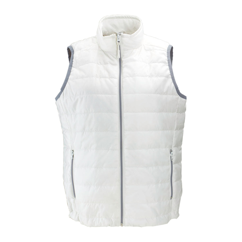 Wear the company logoed Vantage Women's White Apex Compressible Quilted Vest to create a layer of warmth, without adding material bulk that restricts your movement. You can also put on the chic corporate apparel as an outer layer when the weather turns warmer. The visually appealing quilt stitch design ensures the thick insulation remains in place to trap body heat. Remain dry throughout every camping trip because of the water repellent finish. Fold the jacket into the self-pouch for convenient access on business trips. Add a custom logo on the large imprint area to boost the image of your company in the community.Highlights