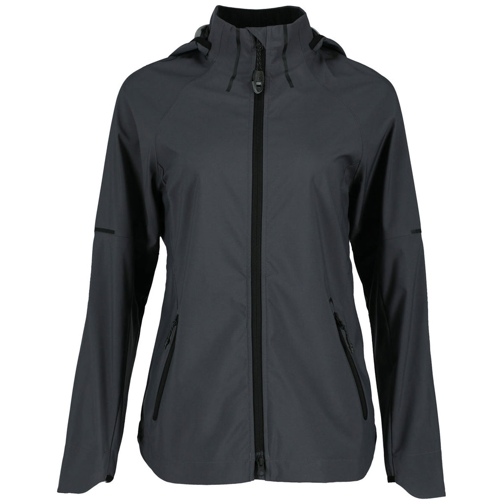Add embroidery to the Elevate Women's Grey Storm Oracle Softshell Jacket for a custom look that keeps you protected from the weather and others. The three-layer construction is waterproof and breathable, but still lightweight. Complete with a graphic camo pattern interior for added style, this front zip jacket has an interior zippered pocket with a zipper that doubles as a whistle for safety. Add a company logo to offer these as employee gifts or to use as part of a uniform. Add a custom logo to keep those you love safe whether they are hiking, commuting, or running errands. The snap off hood allows for options with this must have design.Corresponding Men's Style:Elevate Men's Grey Storm Oracle Softshell Jacket