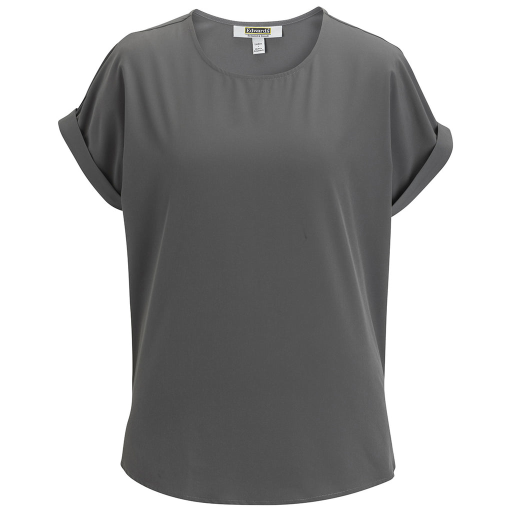 Add an embroidered custom logo to the Edwards Women's Charcoal Dolman Blouse for a clean cut look that can serve multiple functions. The polyester rich spandex blend is ideal for uniforms with rolled-up sleeves and a pullover style that can be home laundered and is wrinkle resistant. Add a corporate logo for employee wear that can be used in multiple locations. Place an order today.