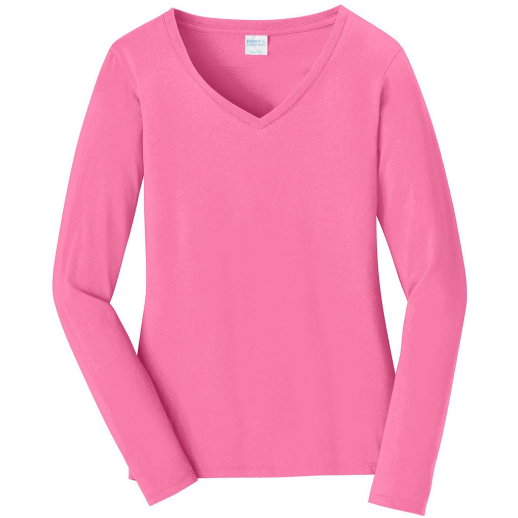 Do moisture laden t-shirts bog you down whenever you need to ramp up the competitive juices? Port & Company Women's New Pink Long Sleeve Fan Favorite V-Neck Tee contain moisture wicking technology that quickly evaporates perspiration the instant it forms on your skin. The result is a cooling of the skin that invigorates your body. Set-in sleeves allow for more arm movement, which comes in handy on the golf course and tennis court. The super soft fabric endures countless wash and dry cycles, without any of the colors fading. One-hundred percent rugged polyester interlock resists rips and tears. Attach your company logo to the t-shirts to spread the word about your brand.Highlights