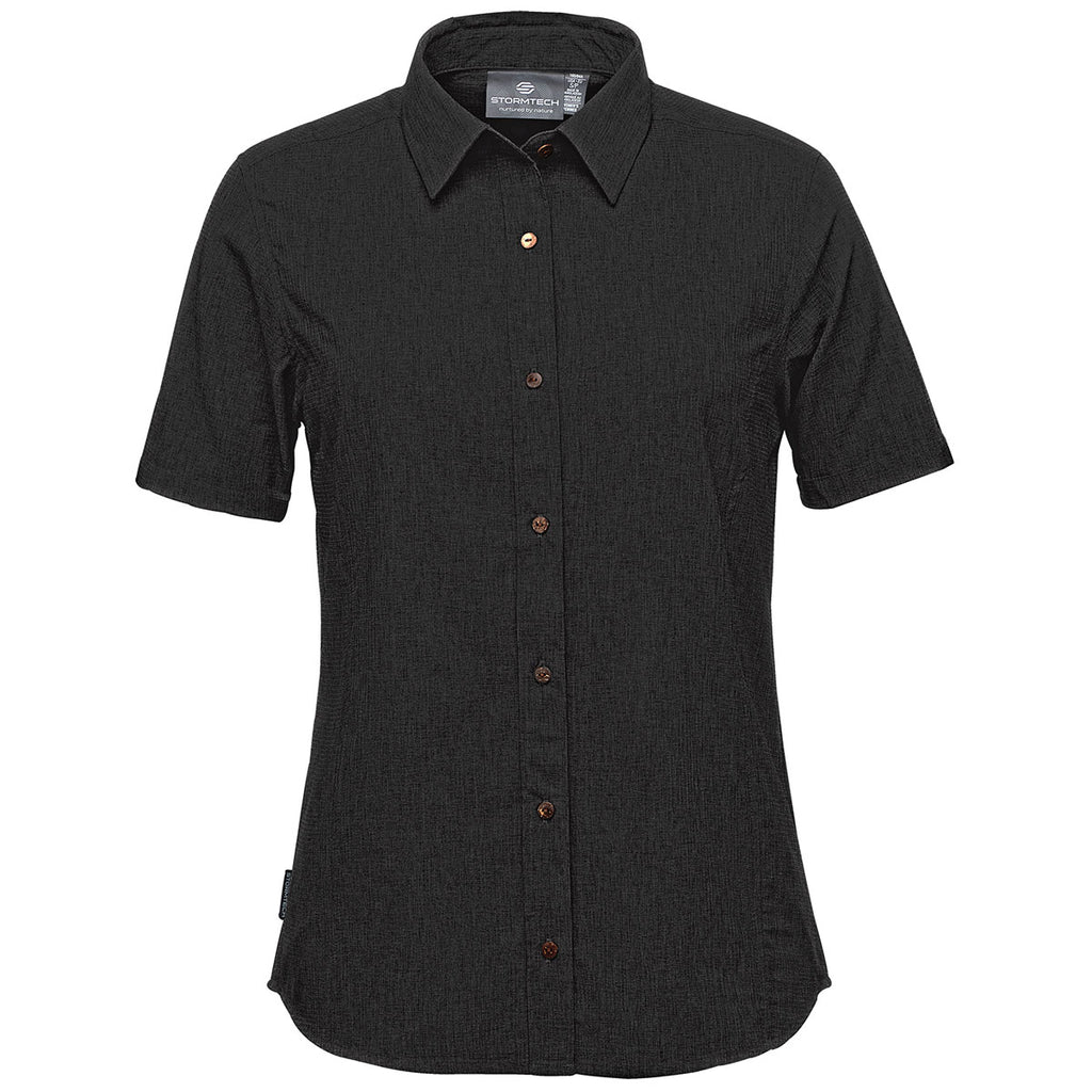 Create a custom logo for the Stormtech Women's Black Azores Quick Dry Shirt to enjoy a laid back, yet fashionable look that can go from the workplace to an evening with friends with ease. The short sleeve button up shirt with a slight feminine fit is made to stand up to whatever your day holds. Add a company logo to use as employee apparel or part of a uniform or something custom to use for special events and gifts. Ultra-lightweight and quick drying, this shirt is for the hardest working among us.
