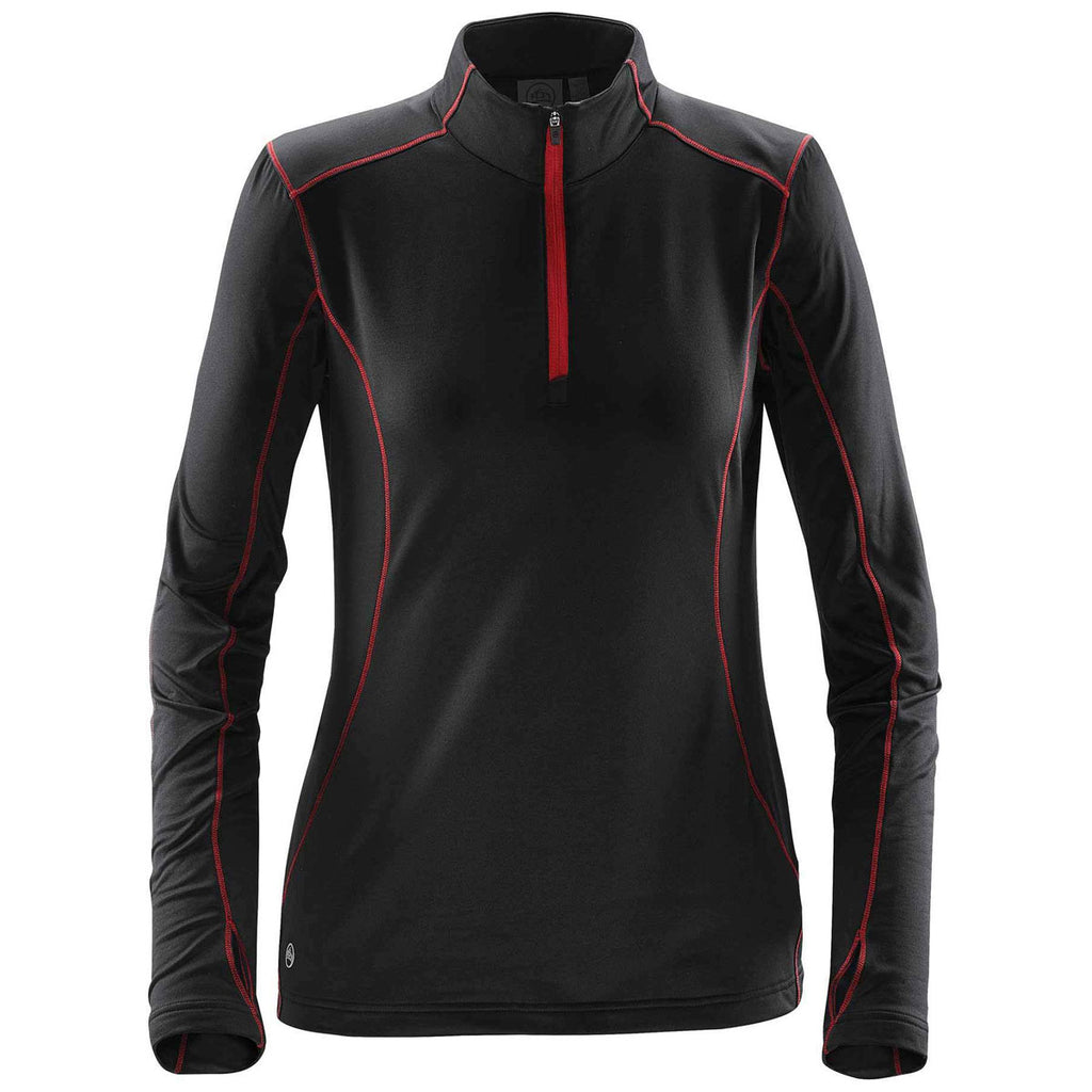 Wear a pullover offering a streamlined base layer that still traps body heat by ordering the embroidered Stormtech Women's Black/Bright Red Pulse Fleece Pullover. The highly functional pullover comes with proprietary H2X-DRY fabric technology that quickly evaporates moisture to keep the body comfortably dry. You also benefit from the moisture wicking technology because it helps regulate your body temperature. Add a custom logo on the large area on the pullover to reach more customer prospects at company events. With a quarter-zip feature, the pullover allows you to pull up the collar to keep the neck and lower face warm when Old Man Winter calls.Corresponding Men's Style: Stormtech Men's Black/Bright Red Pulse Fleece Pullover