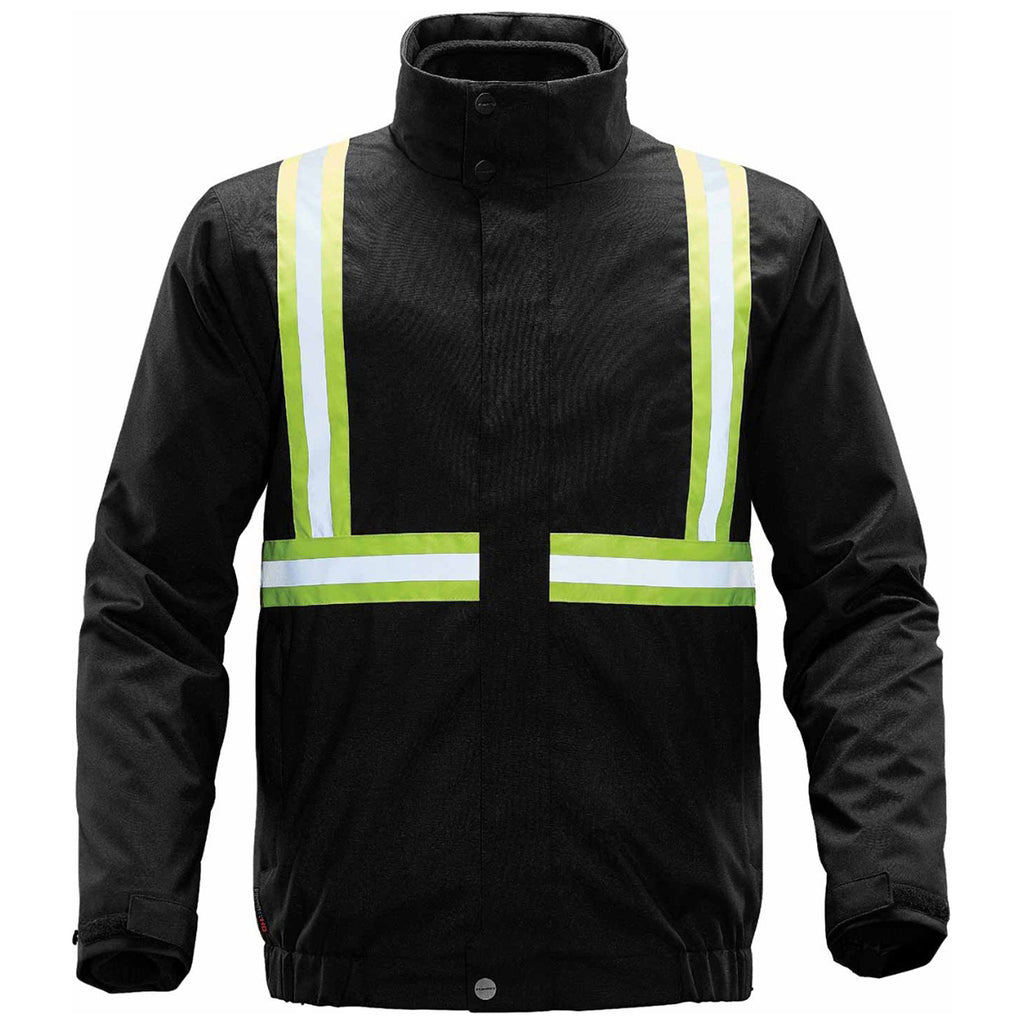 Get noticed in a custom Stormtech Men's Black HD 3-in-1 Reflective Jacket in black and reflective stripping. The classic bomber styling offers convertible adaptability with a shell that will carry your custom logo with pride. The zip out fleece liner can be used in colder weather and taken out when not needed. Perfect as part of employee apparel for those who work outdoors and need to be noticed while doing so. Four pockets, on the inside and out, mean all your items will remain safe and secure. Add embroidery to use these as corporate gifts at the company outing or just to give to dedicated employees.Highlights