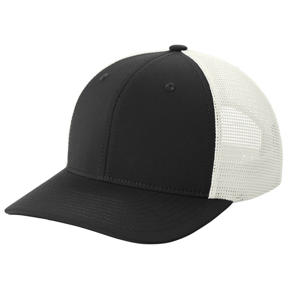 Add your custom logo to the Sport-Tek Black/ White Club Trucker Cap to make sure your brand gets recognized. This one-size-fits-most cap is adjustable with a snapback closure in true trucker style. The structured, mid-profile with mesh backing has a curved bill and moisture-wicking sweatband. Great as a promotional item.Highlights