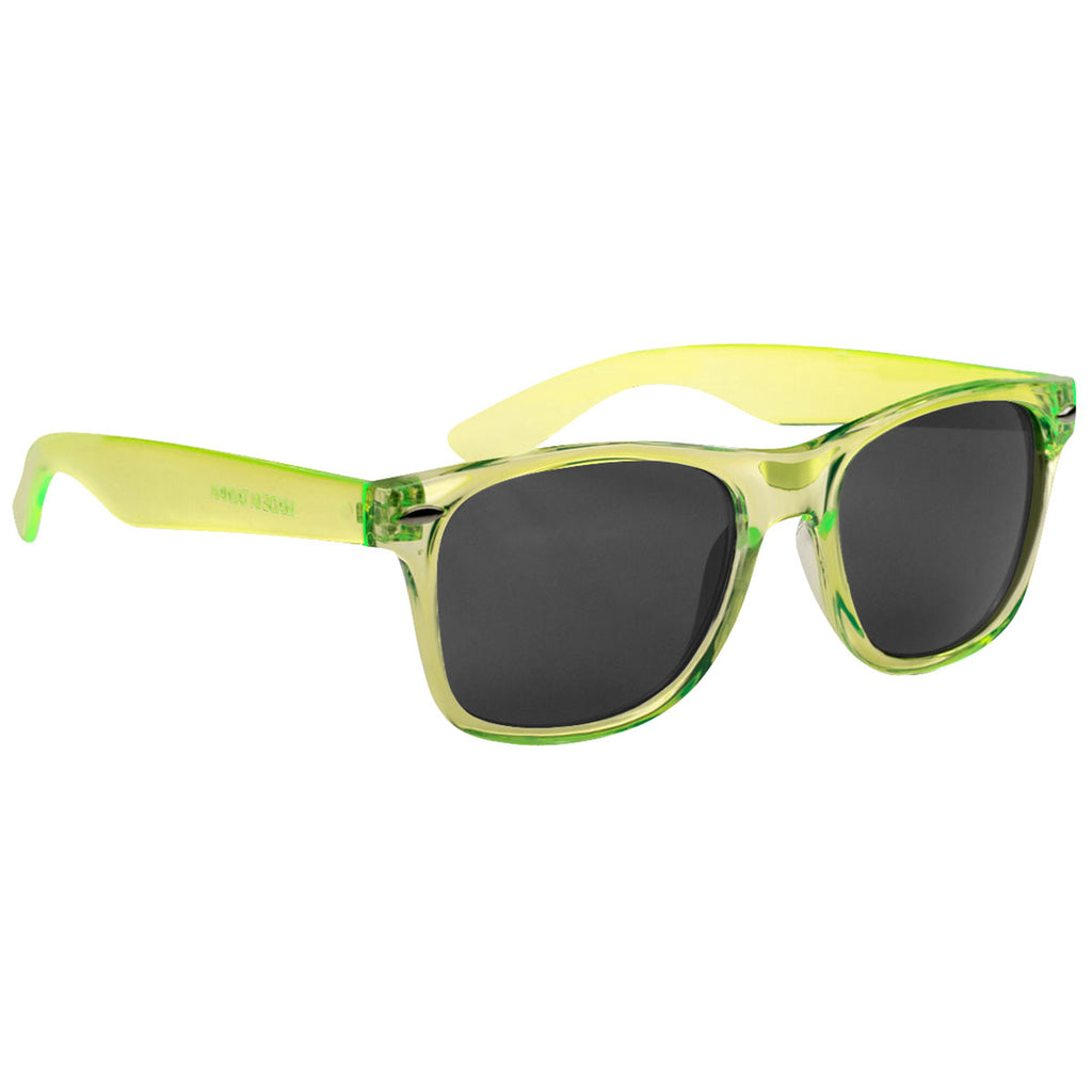 Stay cool in custom Hit Translucent Lime Green Malibu Sunglasses. These sunglasses come in multiple colors, some of which are made of recycled materials. The UV400 lenses provide 100% UVA and UVB protection so you can enjoy a day at the beach, a sunny morning jog, or a long drive in the car with ease. A perfect addition to many shops.