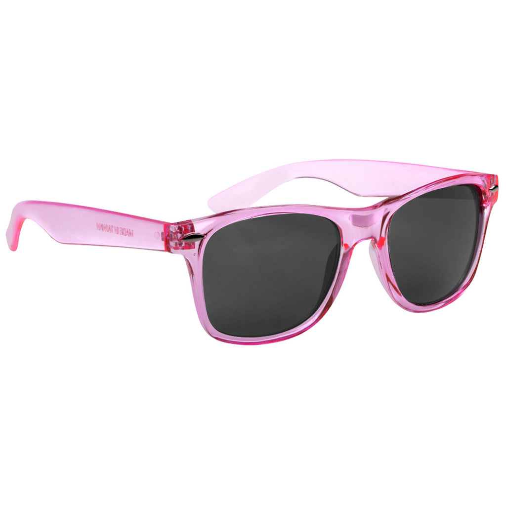 Stay cool in custom Hit Translucent Pink Malibu Sunglasses. These sunglasses come in multiple colors, some of which are made of recycled materials. The UV400 lenses provide 100% UVA and UVB protection so you can enjoy a day at the beach, a sunny morning jog, or a long drive in the car with ease. A perfect addition to many shops.