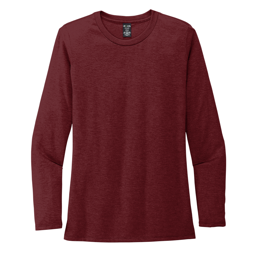 Add screen print to the Allmade Women's Vino Red Tri-Blend Long Sleeve Tee for a look that everyone can enjoy. Your custom logo will appear on this piece of sustainable clothing that is durable and fashion friendly. Add a company logo to use as employee gifts or uniform pieces in some industries. Easy to wear alone or layer when the weather is cooler, this long sleeve tee should be welcomed into every wardrobe. Recycled apparel is not only durable, but fashion forward while saving the earth. Each tee uses material the equivalent of up to six recycled plastic bottles.