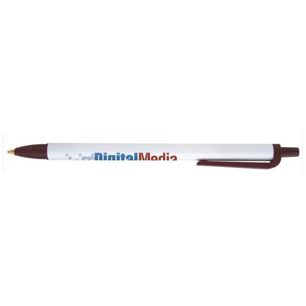 Good Value Burgundy with Blue Ink Contender Pen with a corproate brand is a cost effective way to showcase your brand or organization for the entire use of the pen. The practical design of this pen with a white barrel and contrasting trim means your name or logo will be the star. Great for giveaways, new clients, or general daily use. Order today.