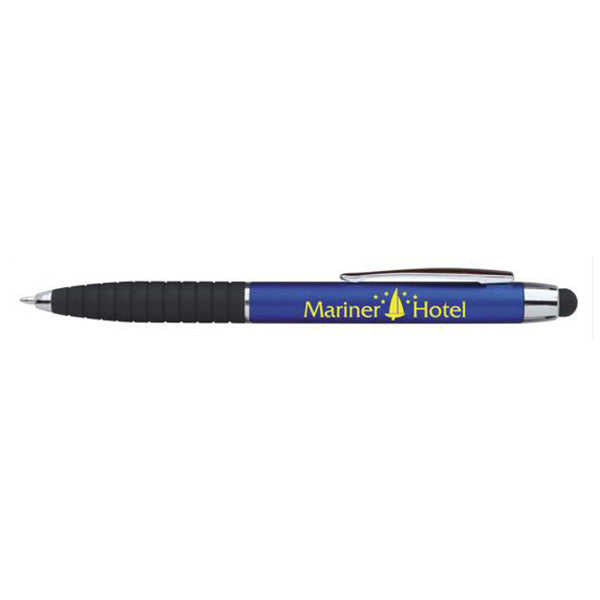 Design a unique logo for the Good Value Blue with Black Ink Metallic Cool Grip Stylus Pen and share with everyone you meet. These metallic twist open pens are designed with a solid black grip for comfort when writing or flip it around and use it as a stylus to text or write on your screen. Perfect for businesses, schools, and special events.The minimum order for this product is 500 pieces.