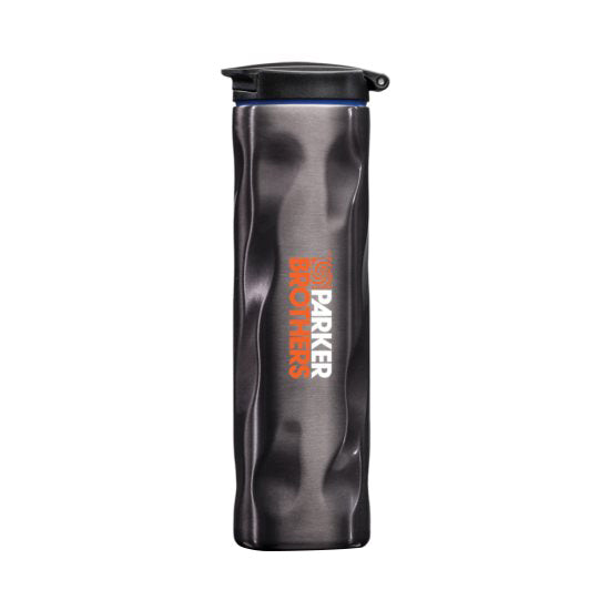 K & R's Chiseled 16oz tumbler features a sturdy stainless steel build and a screw on, spill proof flip lid with a contrasting silicone ring. Customize this tumbler by adding an imprint of your custom logo for promoting your company, fundraising or corporate gift giving.
