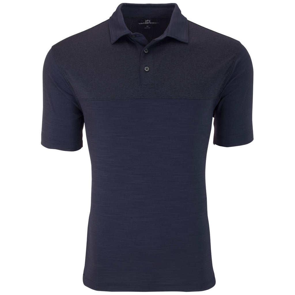 A great custom polo is a must have and the Vansport Men's Navy Pro Horizon Polo will not disappoint. The mix of tonal textures offer visual interest to this sporty polo that is made to perform. Whether you need a custom look to play in a golf tournament or something that can serve as corporate apparel when worn with a sport coat. Add a company logo to use this as employee apparel with moisture wicking and UV properties that keeps everyone looking their best as they work their hardest.
