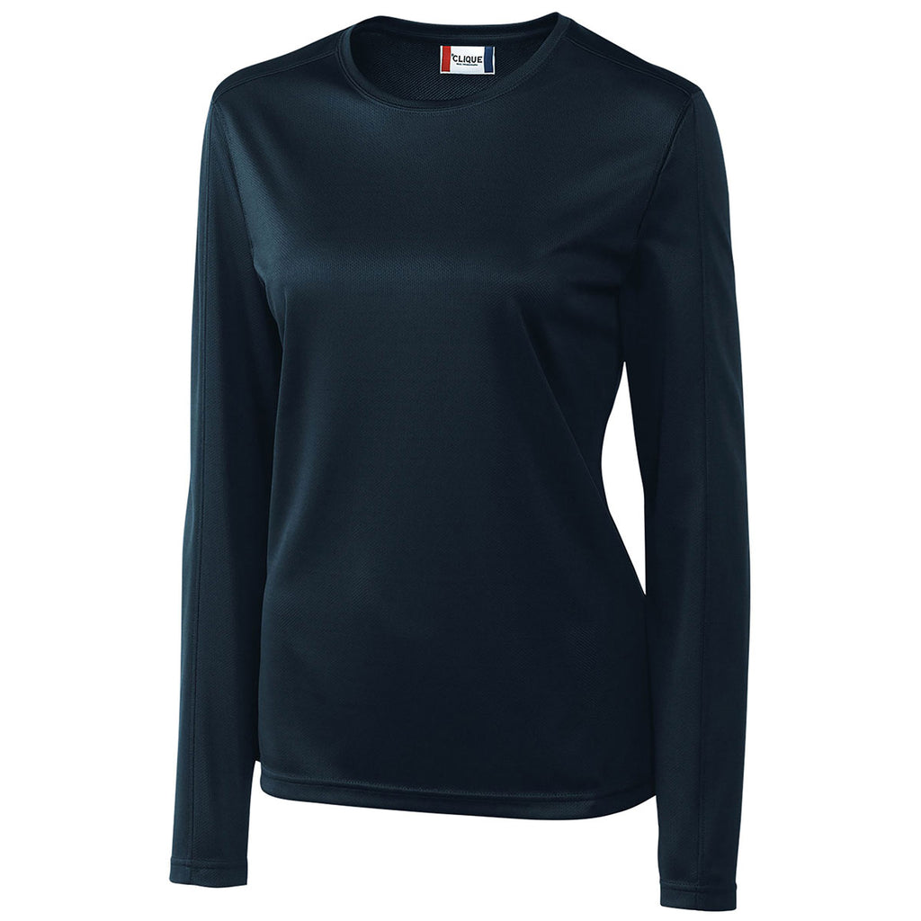 The Clique Women's Dark Navy Long Sleeve Ice Tee offers casual comfort that's sure to be a favorite in your closet. With your company logo added to the shirt in screen print, you can make this shirt even better by adding an advertising component to it. This women's long-sleeve shirt comes in a variety of vibrant colors and offers many wonderful features including a cozy 100% polyester mesh material, double layer neck trim, pieced shoulders and sleeves, fully taped neck seam, and moisture wicking components. Buy this item to hand out at your upcoming corporate events, including trade shows, recruiting events, and more.Corresponding Men's Style:Clique Men's Dark Navy Long Sleeve Ice Tee