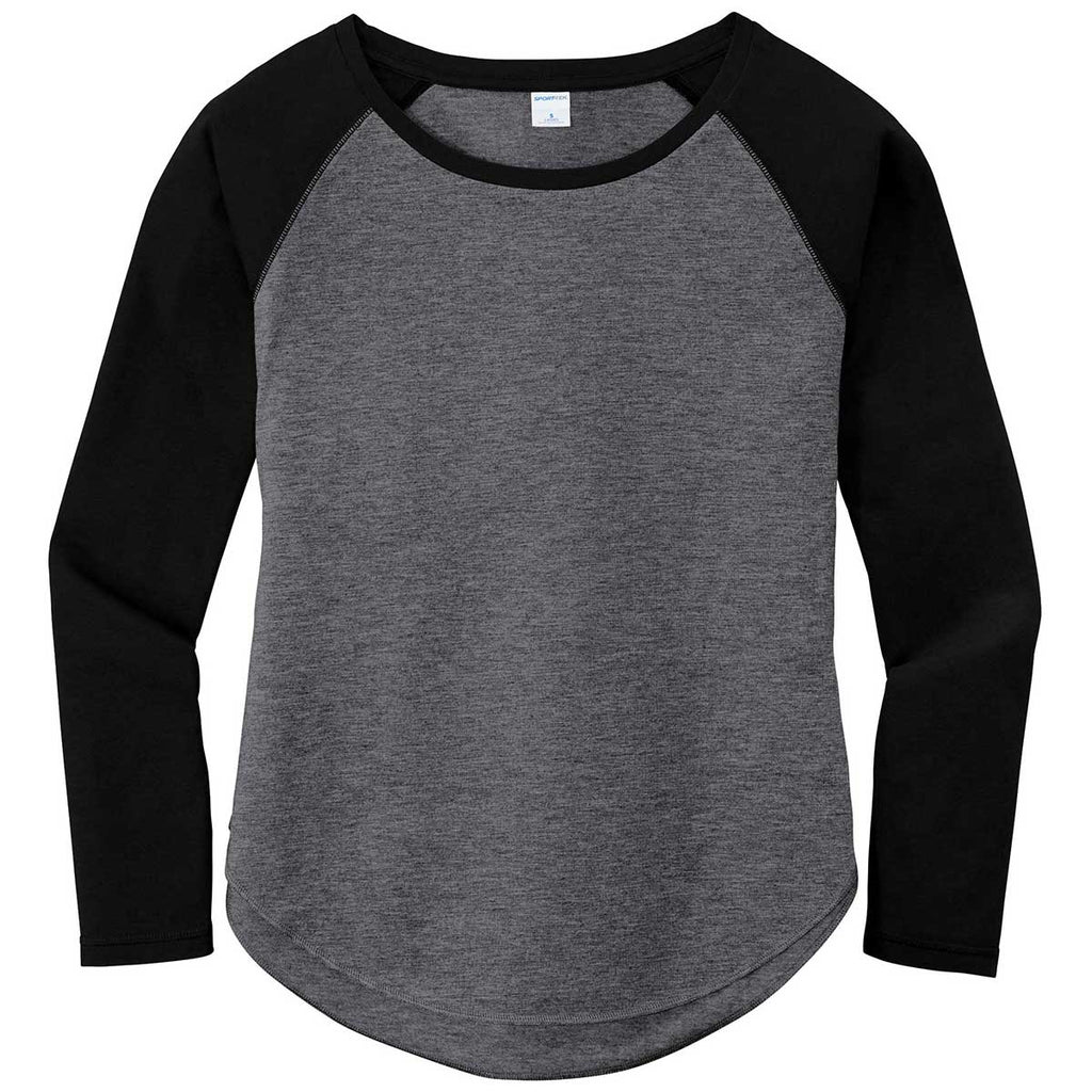 Sport-Tek Women's Black Triad Solid/Dark Grey Heather PosiCharge Long Sleeve Tri-Blend Wicking Scoop Neck Raglan Tee