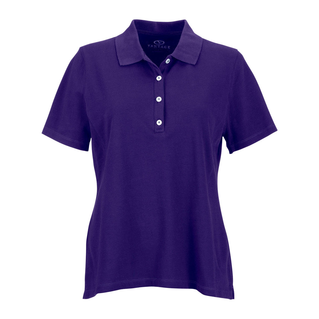 Enjoy the feel and appearance of the embroidered Vantage Women's Purple Perfect Polo, which uses fine gauge pique to create strong corporate apparel for all occasions. Extra length in the body offers you more fabric to tuck the shirt in for formal corporate events. A little spandex enhances your mobility to give you a polo that works well in several different sports settings. Wear the versatile polo with a pair of khakis and pair the chic company garment with dress slacks. Pure combed cotton feels super soft against the skin to ensure you feel fresh throughout the day. Add a custom logo and watch recognition of your products reach more customer prospects.Corresponding Men's Style: Vantage Men's Purple Perfect Polo