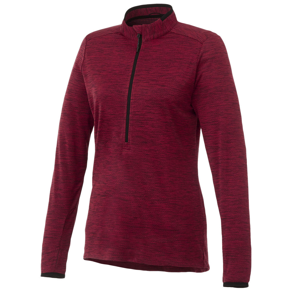 Add a company logo to the Elevate Women's Team Red Heather Mather Knit Half Zip for a sleek professional look that can go anywhere. This simple half zip is made for easy layering with thumb holes and half zip style that will stand up to a long day's work as employee apparel or a corporate uniform. The shaped seams and tapered waist offer a feminine fit while the moisture wicking, breathable material keeps you comfortable. Made as a wash and wear item with great versatility, this half zip can go from being team mom to head of a corporation with ease.Corresponding Men's Style:Elevate Men's Team Red Heather Mather Knit Half Zip