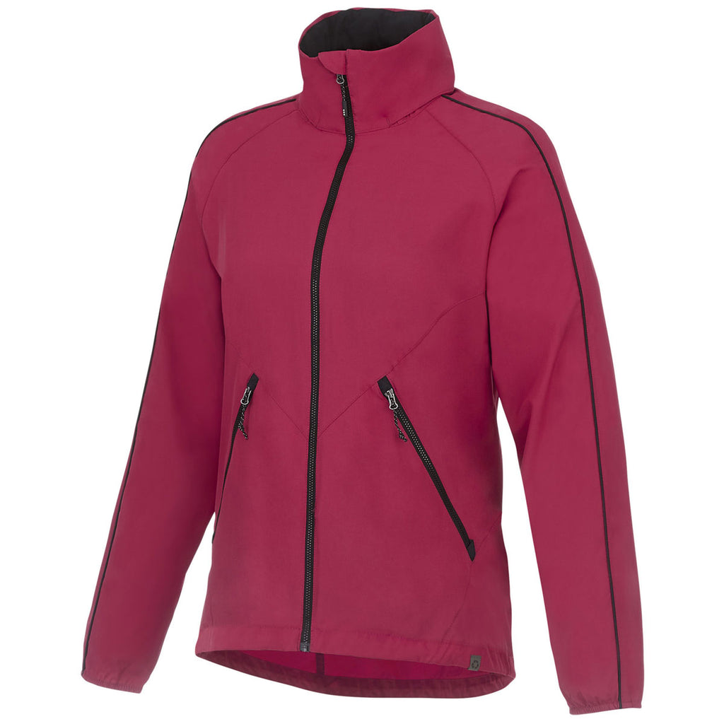 Create a custom look with the Elevate Women's Vintage Red/Black Rincon Eco Packable Jacket with embroidery to match your taste and design. The wind and water-resistant jacket is made of partially recycled materials to help the environment while keeping you looking great. Great for hiking, biking, and enjoying the outdoors, this jacket can also carry your company logo to use as employee apparel. The front zip pockets keep small items safe and the stow away hood keeps you protected when nature strikes. Best of all, when you are done wearing this jacket, stow it away in the built-in sack and pop it into a purse or backpack.Corresponding Men's Style:Elevate Men's Vintage Red/Black Rincon Eco Packable Jacket