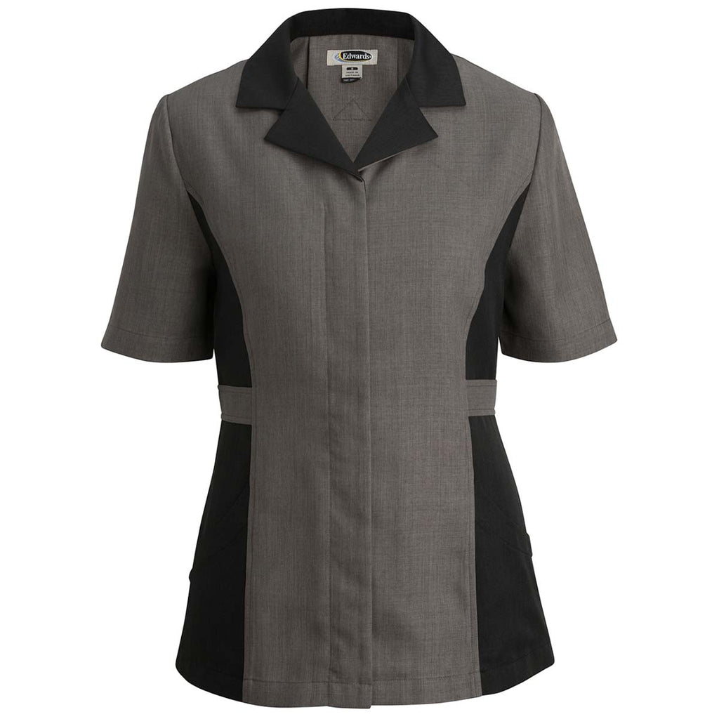 Employee apparel for housekeepers has never looked better than with the Edwards Women's Graphite Premier Tunic Shirt in six color options with contrasting collar and side panels for a fitted look. Created from 100% polyester, this tunic shirt has all the features needed for a long day of housekeeping duties. The hidden placket, deep hip pocket and accent belt on this corporate embroidered shirt offer a polished look. Excellent as part of corporate uniforms, these short sleeve shirts are easily machine laundered so that they are ready for the next shift.Highlights