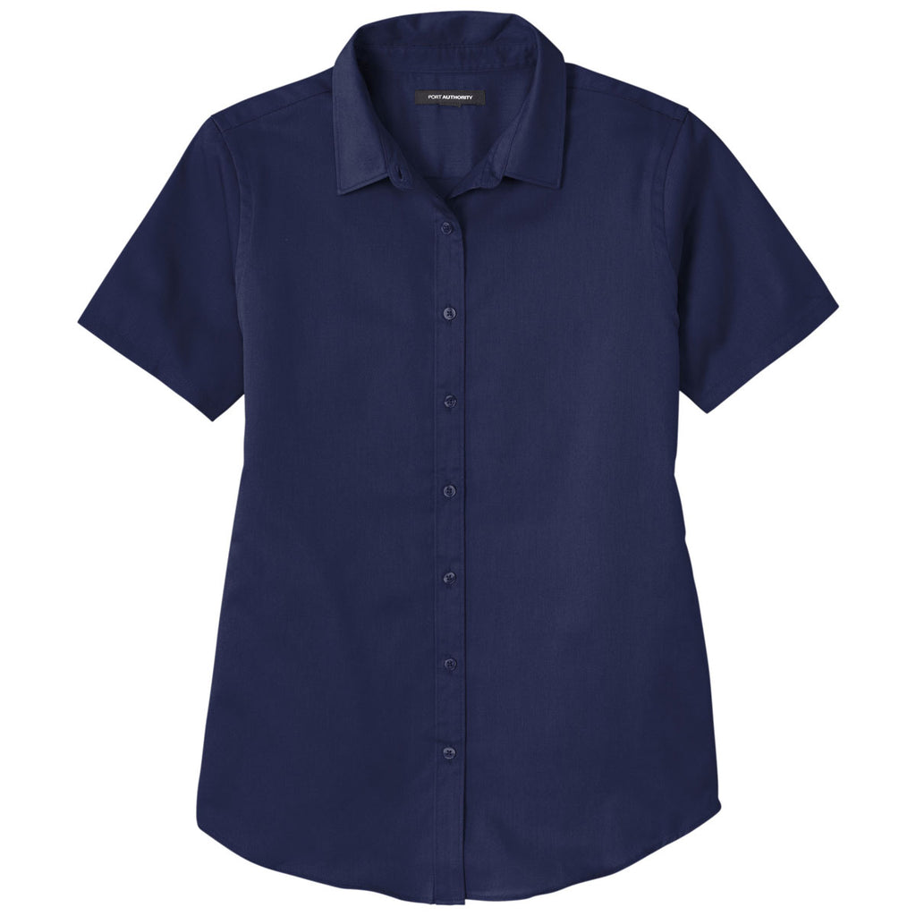 Sport a professional look with the custom embroidery Port Authority Women's True Navy Short Sleeve SuperPro React Twill Shirt. This shirt not only offers a professional look that is perfect for corporate apparel, but is tough enough to stand up to a hard da work. The wrinkle-resistant shirt is soft and smooth for a polished look. Stain release paired with easy care means you can wear this daily without concern. Add a company logo to create community among employees with employee apparel or add a custom logo to include this in a logoed apparel line. The choice is yours.Highlights