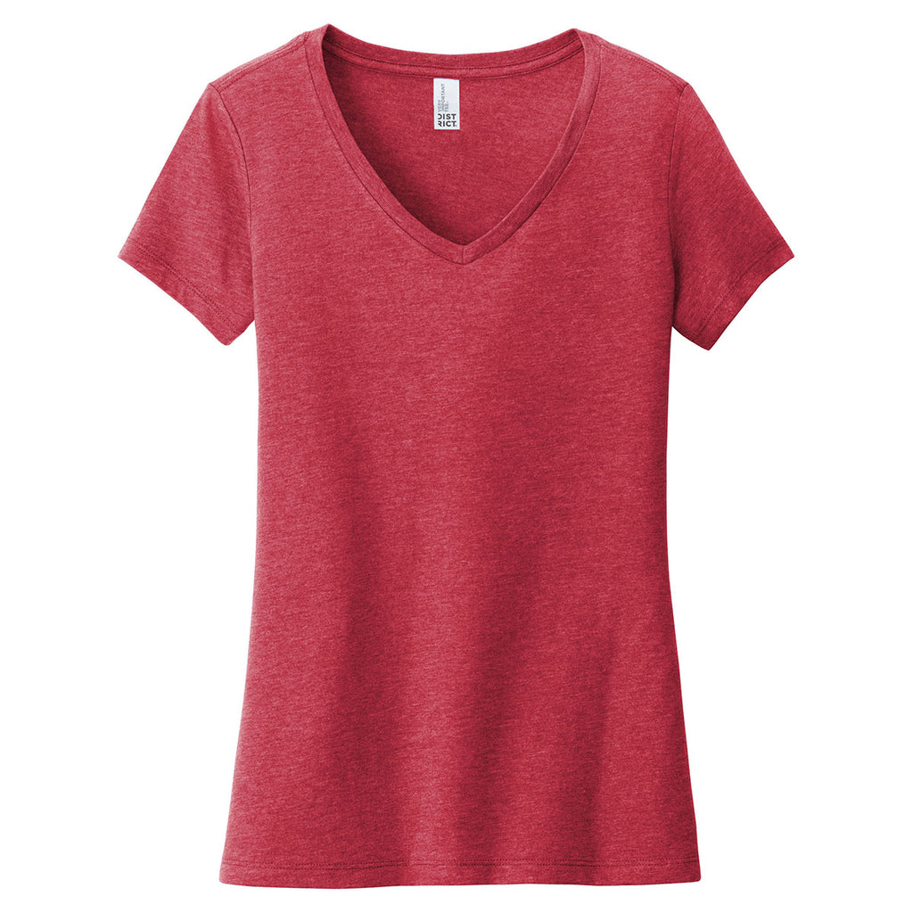 You do not need to wear a tux to feel very important, when you order the decorated District Women's Heathered Red Very Important Tee V-Neck. The fashionable short sleeve shirt features shoulder to shoulder taping that presents a professional appearance for job candidates attending recruiting events. Attach a custom logo to raise the bar for marketing products and services at industry trade shows. Super soft 100% ring spun combed cotton resists rips and tears to give you go to corporate apparel for years to come. The slightly slimmer body and shorter sleeves make the tee v-neck perfect for active outdoor enthusiasts.Highlights