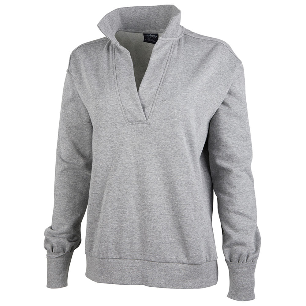 Add embroidery to the Charles River Women's Heather Grey Coastal Sweatshirt for a fun and fashion-friendly look that is comfortable for all-day wear. The polyester fleece/cotton blend is used to create a V-neck sweatshirt with high-low hem and gathering around the yoke. Great as casual wear at home or on the go. Grab this sweatshirt and layer for travel or a quick nine holes at your favorite course. Order today.Highlights