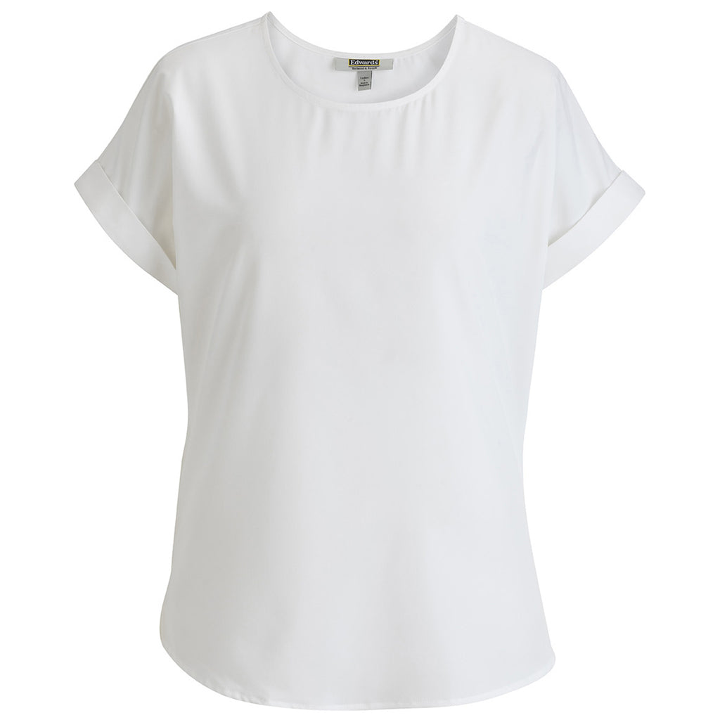 Add an embroidered custom logo to the Edwards Women's White Dolman Blouse for a clean cut look that can serve multiple functions. The polyester rich spandex blend is ideal for uniforms with rolled-up sleeves and a pullover style that can be home laundered and is wrinkle resistant. Add a corporate logo for employee wear that can be used in multiple locations. Place an order today.Highlights