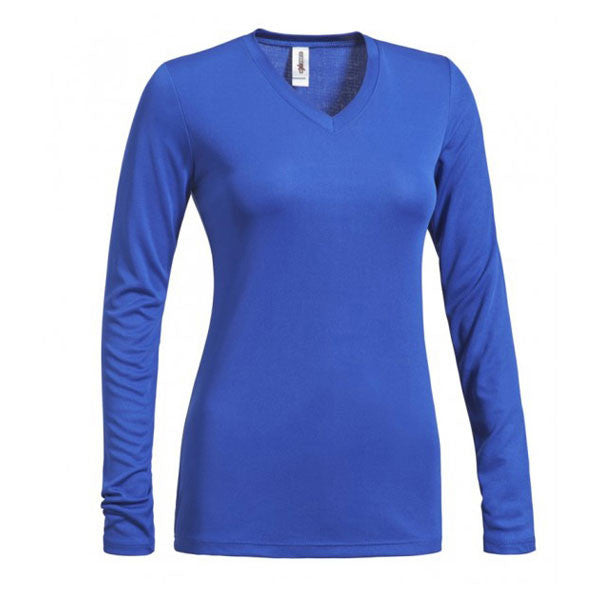 Expert Women's Royal V-Neck Long Sleeve Tee is a superb summer activewear essential. Its classic v-cut neckline adds to cool athletic style and makes for superior breathability. It's breathable and super-comfortable and wicks away sweat cooling you down during cardio or Zumba, and its stretchiness allows you to easily move around. Crafted from 100% microfiber polyester pk maX. Suitable for any sport, this full-sleeve women's t-shirt is customizable with your company's logo for corporate branding or giveaway swag.The minimum order for this product is 12 pieces.