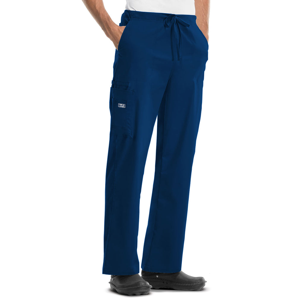 Add your corporate logo on the Cherokee Men's Navy Workwear Premium Core Stretch Drawstring Cargo Pant to draw attention to the positive reputation you have earned by working at a world class healthcare facility. Spandex twill improves mobility and highly durable polyester resists the damage caused by small rips and large tears. Adjust the drawstring to find the ideal fit around your waist. The unisex cargo pant includes a natural rise that enhances the visual appeal of the garment. Five storage pockets allow you to organize everything you need to make the rounds during 12-hour shifts. Use the instrument loop to gain quick access to important medical tools.Highlights