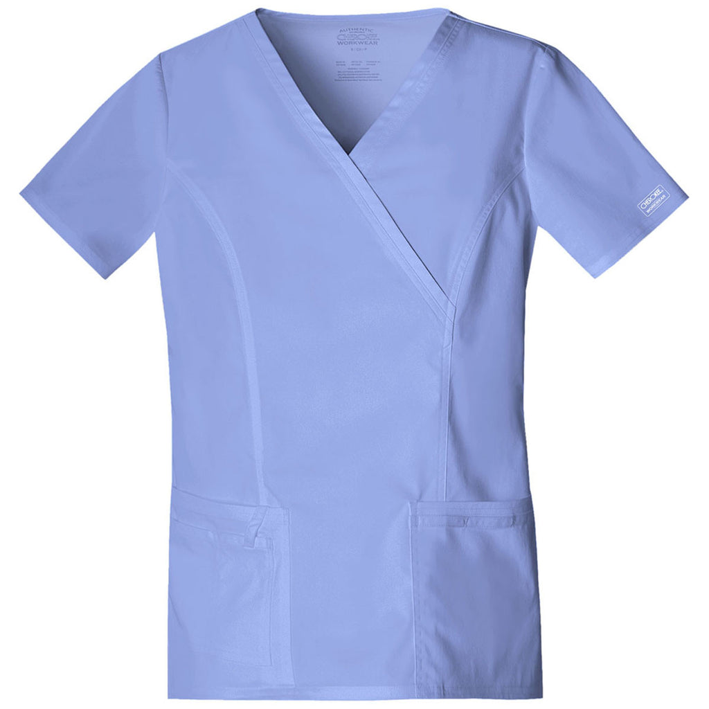 Let's face it: workwear isn't always ideal. And getting work done in an effective, efficient top while feeling good and comfortable isn't always easy. With this Cherokee Workwear Women's Ceil Blue Premium Core Stretch Mock Wrap Top...it's a breeze.Highlights