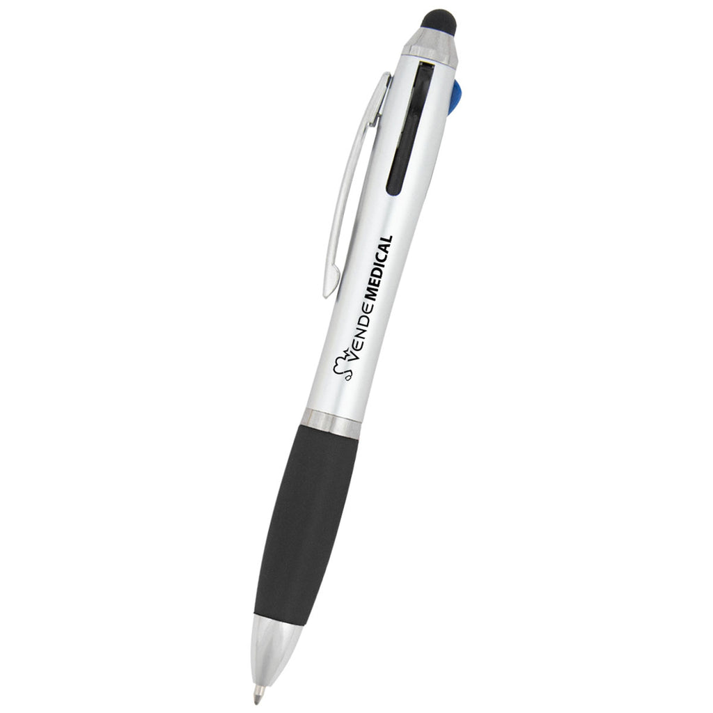 Be creative with a custom Hit Silver with Black 3-In-One Pen with Stylus. This useful pen makes sure you can mark papers or write notes with ease. Created with three different colored inks, blue, black, and red, in a single pen, you can take notes and then use it as a stylus in a matter of seconds. Perfect for the office, home, or classroom.