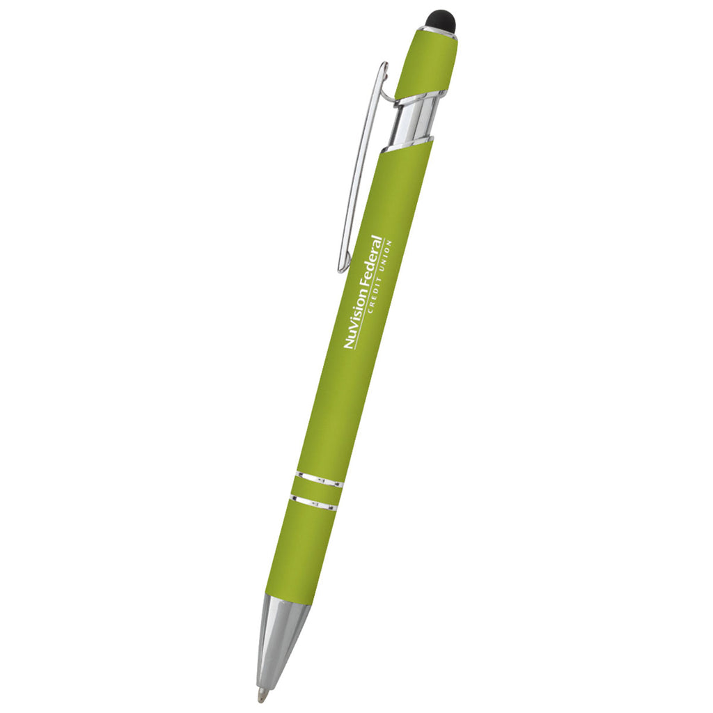 Hit Lime Green Incline Stylus Pen with a corporate logo comes in a variety of colors to fit your supply needs. The stylish pen serves the dual purposes of writing and serving as a stylus while coming in a convenient gift pouch for easy gift-giving. Great for new clients, graduations, or special events while networking.