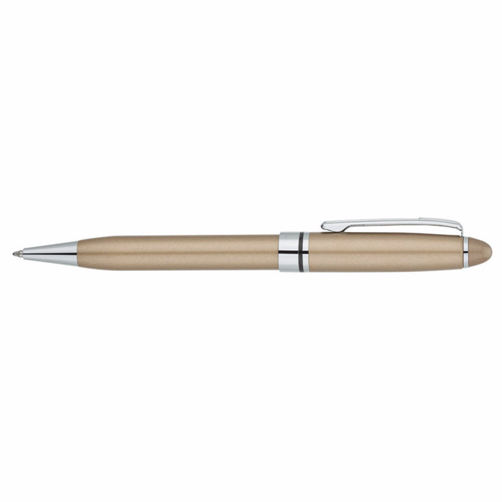 A classic everyday writing staple, the Valumark Gold Dulce Ballpoint Pen is for anyone with a penchant for fine stationery. This pen can be engraved with the brand logo or company name for your very own custom flare. It works with a twist-action mechanism and boasts a brass built with chrome accents.