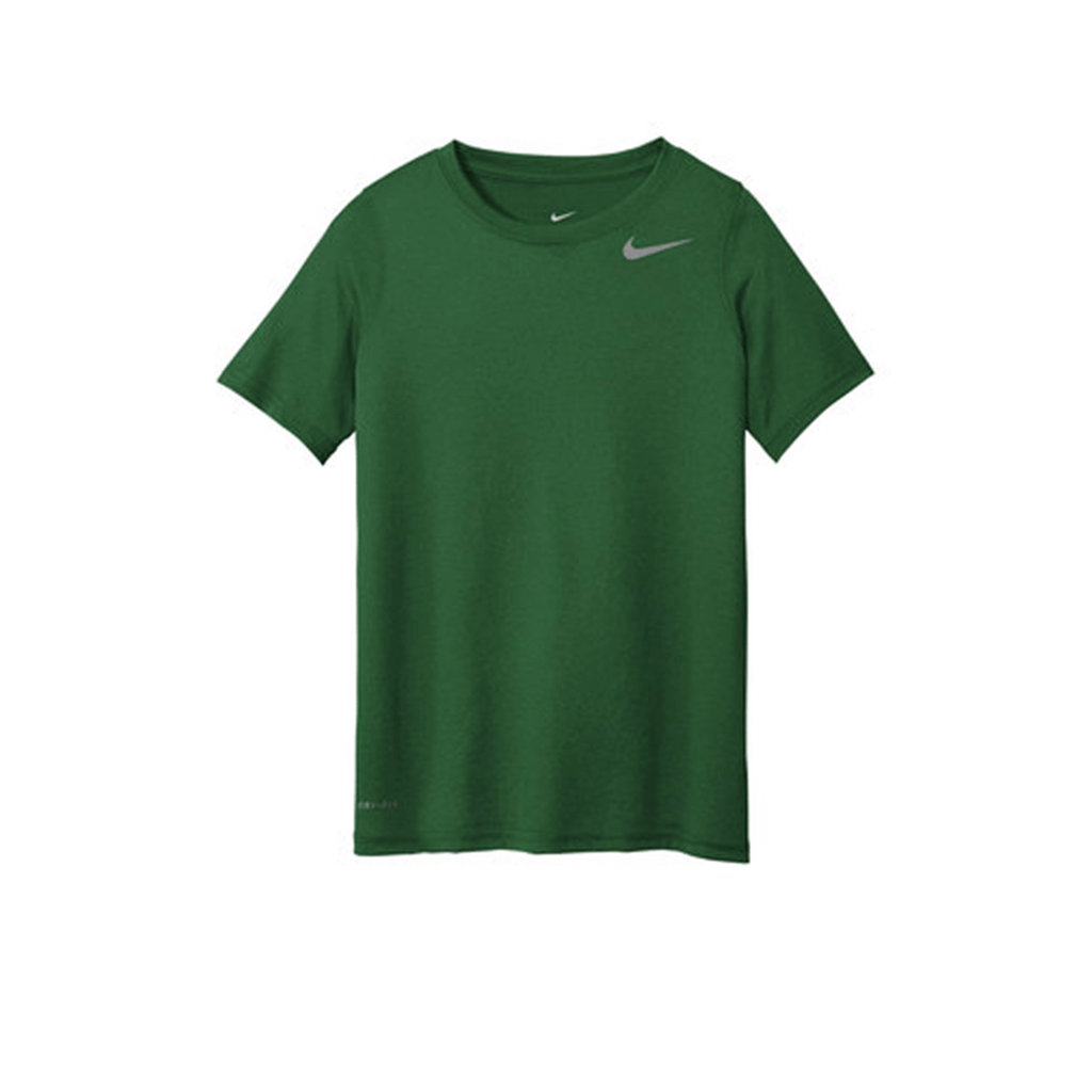 Create a custom team uniform with the Nike Youth Gorge Green Legend Tee. This youth version of the Legend tee is a Nike staple in athleisure apparel that can serve many functions. Add a company logo to use as a uniform for a sports team that you support or a custom logo to offer for younger people who are part of your organization or cause. The legendary tee offers Dri-FIT technology to wick away sweat whether playing the infield, enjoying a pick-up game at the park, or working out on your own. Highly durable with tag free comfort, this polyester jersey is lightweight and ready for whatever you do.