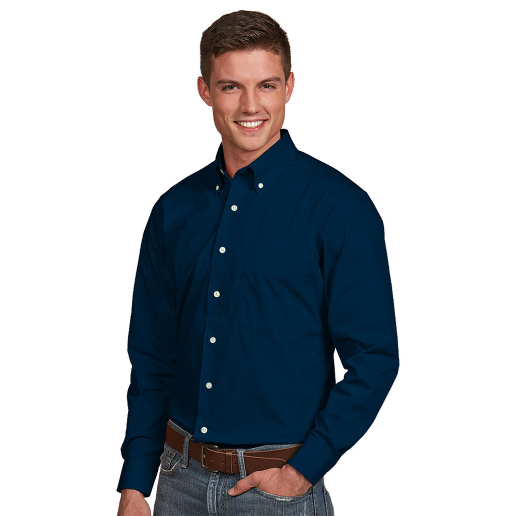 Outfit your team with their new trade show attire by choosing the corporate embroidered Antigua Men's Navy Dynasty Shirt for your next custom apparel order. The versatile button down long sleeve shirt is the ideal layering garment for active professionals. Super smooth cotton and durable polyester blend together seamlessly to resist wrinkles and stains. Attach your company logo on the large imprint area to reach more potential customers at business conferences. Your team will look polished and professional when they are sporting this Antigua shirt with your embroidered logo at the next event. When it comes to comfortable dress shirts, it doesn't get much better than this.Corresponding Women's Style: Antigua Women's Navy Dynasty Shirt
