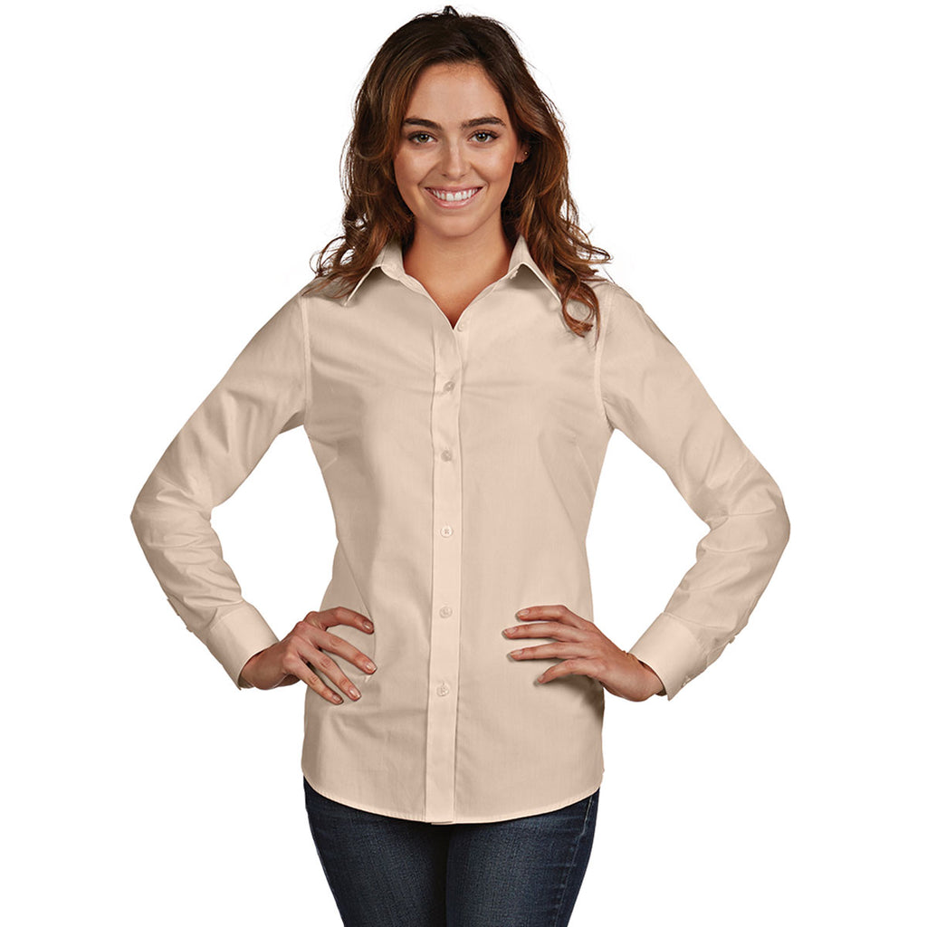 Create a corporate apparel must-have by giving away the custom logoed Antigua Women's Vanilla Dynasty Shirt. Even when your workday spirals with added tasks and projects, the classically designed stylish shirt will present a polished professional image. The tail bottom gives you plenty of fabric to tuck the business shirt into a pair of dress pants or a skirt. Cotton and polyester combine to produce the one-two company apparel punch of super soft feel and long lasting durability. Add your corporate logo on the large imprint area to promote your company at company events and industry trade shows.Corresponding Men's Style: Antigua Men's Vanilla Dynasty Shirt