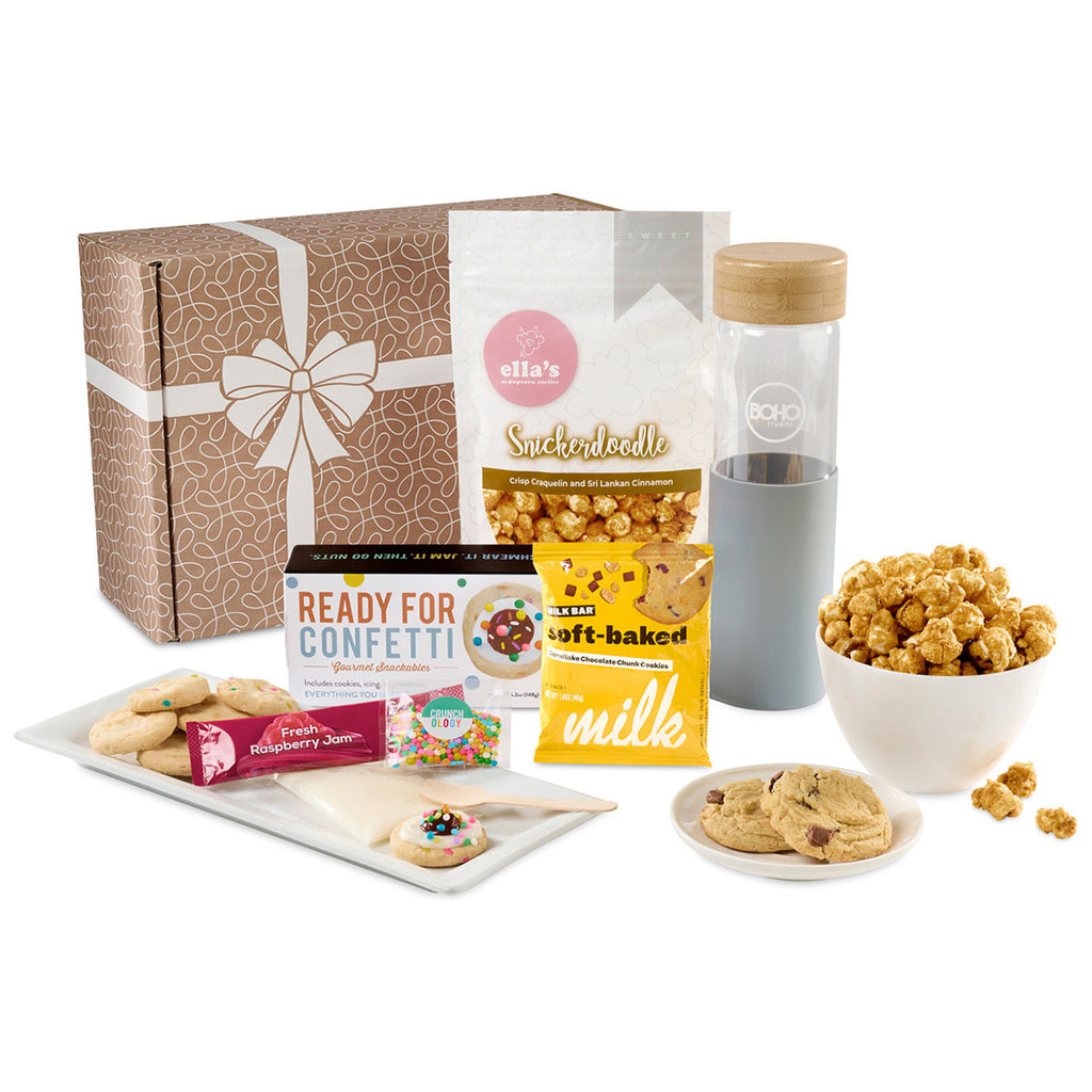Celebrate your team's big accomplishment by giving them a Gourmet Expressions Dove Grey Ready For Confetti Celebration Gift Set that features your company's custom logo or design. Along with a personalized 20 oz Aviana Journey bottle, this stylish set comes complete with a selection of delicious gourmet sweets.
