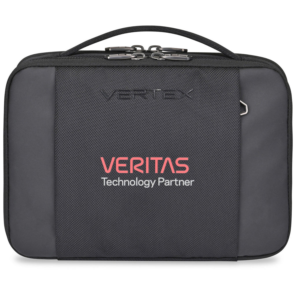 Vertex Black Brooklyn Tech Case with a corporate logo helps employees or customers keep tech organized and safe. The dual-compartment storage unit with webbing organizer for cords, a stylus, or pens is perfect for the office, the commute, or travel to make sure your tech is at hand at a moment' s notice.