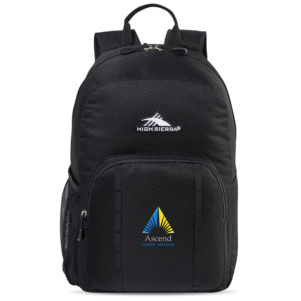 Get organized with a custom High Sierra Black Pilsen Backpack. This classically styled backpack is perfect for work, school, or after-school activities. The large capacity main compartment is great for files or notes and the interior sleeve easily carries a 14" tablet. The front pocket with an organizer secures multiple items and a mesh side pocket is perfect for a water bottle.