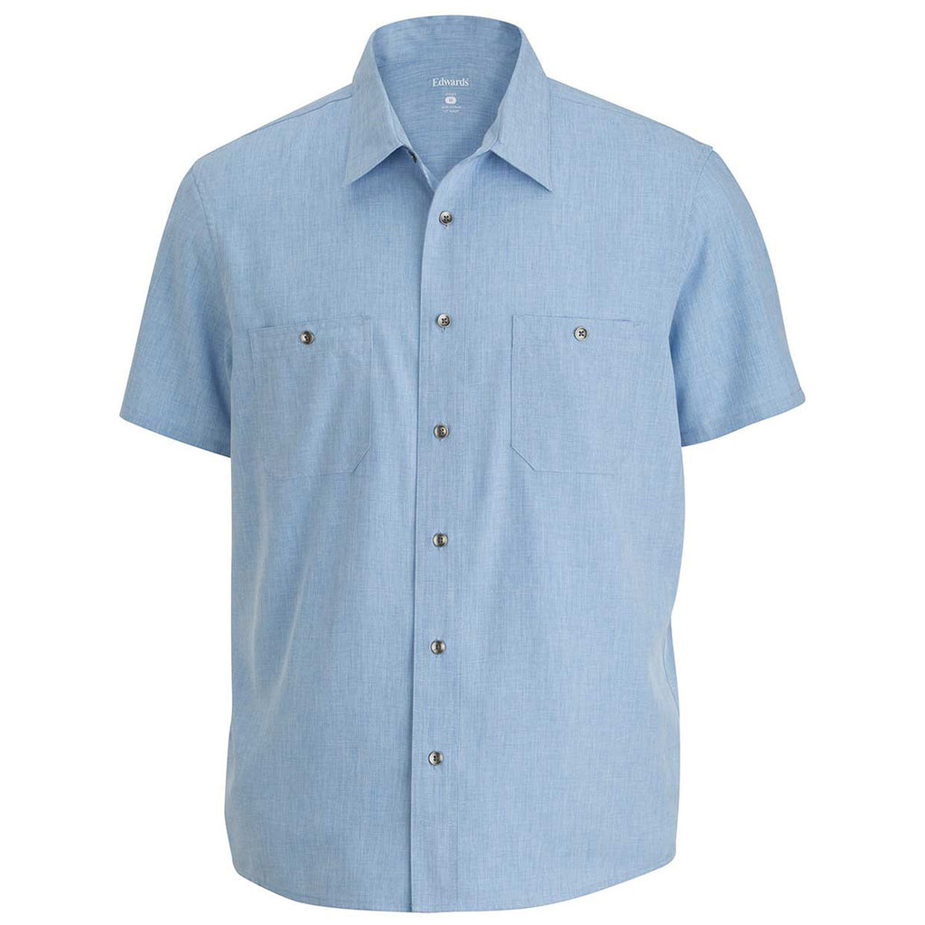 Edwards Men's Carolina Blue Heather Melange Ultra-Light Chambray Shirt with embroidery creates a stylish look ready for the office or a night out. The short sleeve button-up with two chest pockets is ultra-light making it great for the office with a jacket as a uniform or to head out with friends. Place an order today before these sell out.Highlights