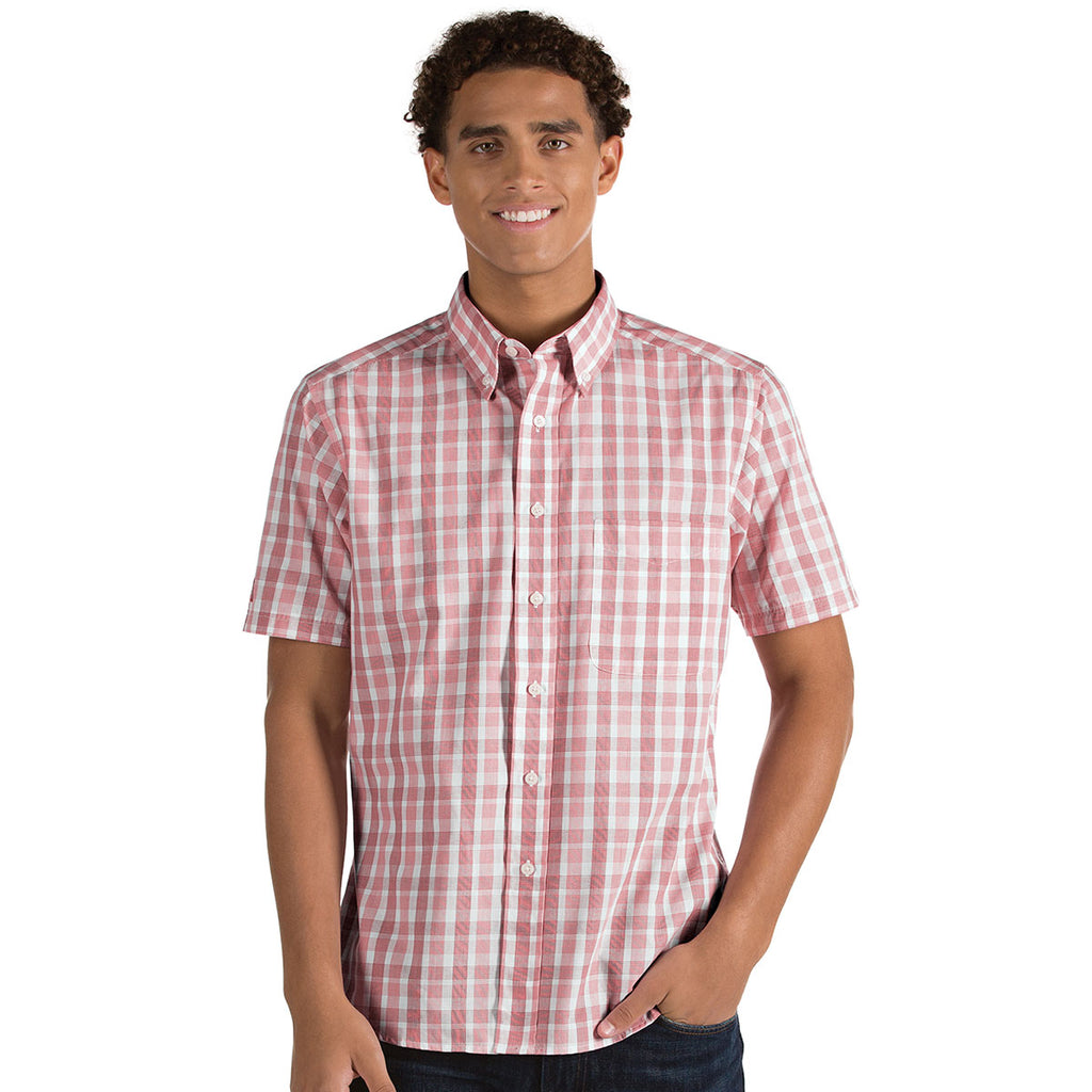 Classic design with a bit of flair is found in the Antigua Men's Dark Red/Silver/White Crew with plaid color options. Made of a cotton, polyester blend the button down collar and tail bottom allows for the professional or laid back look to be accomplished with a single garment. Add a custom logo or corporate embroidery to use this button down as a part of employee apparel or keep your chosen employees and yourself looking top-notch at the next trade show. Offering a professional look that can be dressed up or down, the open cuffs and self fabric chest pocket are the small details that make a real difference. Place your order today!Highlights