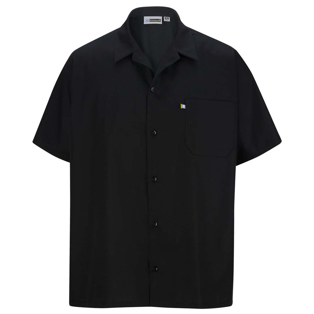 Your staff will look amazing in a custom embroidered Edwards Men's Black Button Front Shirt in bold black or crisp white. Add your company logo or corporate embroidery to these button front chef shirts for a professional look that is easy to wear and care for. Made of breathable polyester and cotton fabric this traditional look offers a chef collar and six button placket for layering. Short sleeves and a left chest pocket mean even in the hottest environments, your staff will keep cool. Excellent as corporate uniforms or for your foodie friends.Highlights