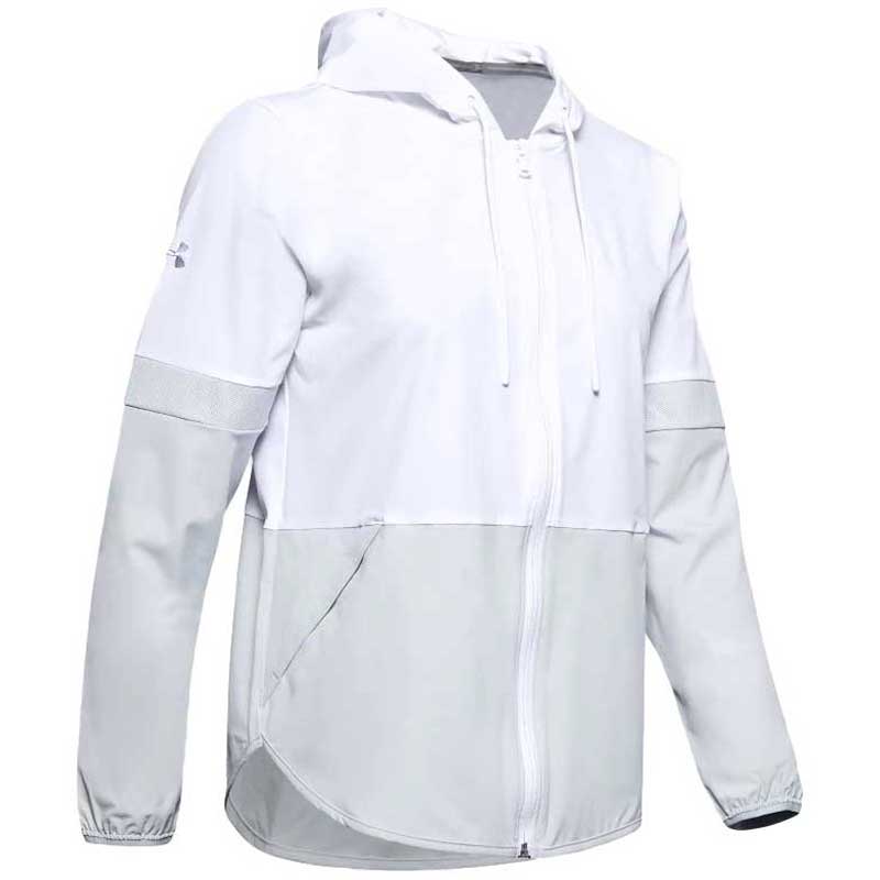 Enjoy a fun and functional look with a custom embroidered Under Armour Women's White Squad Woven Jacket. The two-toned jacket is lightweight and loose fitting to function as warm-up gear for team events or part of company uniforms with a custom logo printed neatly on the chest or sleeve. The unlined hood has a drawstring to create a snug fit and keep out the wind. Add the embroidery of your choice to create the perfect personalized end of the year gift for friends, family, and employees. These jackets will be loved by those who have the opportunity to enjoy them.Highlights