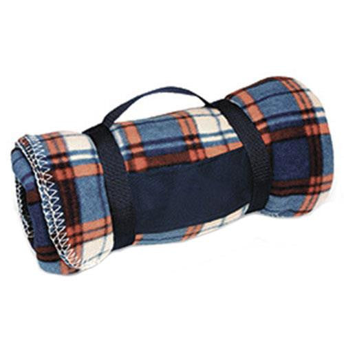 Attach the carrying strap to the Blue/Rust Plaid Travel Blanket for easy transport from your car to a camping site. The versatile blanket keeps you warm by a roaring campfire. The elegant plaid design makes the blanket stand out among the competition. Now that you have everyone's attention, display your corporate logo to build a bond with potential customers. Rugged materials resist the types of rips and tears that lead to large holes. The blanket roles into a small size for convenient storage.