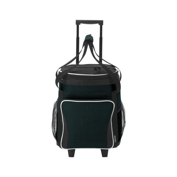 Help your company's customers and employees whoop it up on game day events with this custom-logoed 48-Hour Koozie Charcoal Tailgate Rolling Kooler. Whether its tailgate outside the stadium or a party at home, this rolling cooler will keep food and drinks cool thanks to its heat-sealed PEVA liner. Featuring a retractable handle, roomy main compartment and extra pockets, this cooler is ideal for picnics or corporate meet-ups.