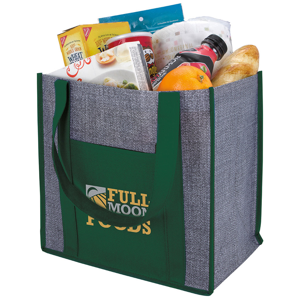 Choose your logo for the Good Value Hunter Green Laminated Heathered Non-Woven Grocery Tote to share your brand with the masses. This tote is perfect for keeping the car organized, a quick trip to the market, or snacks on your next road trip. The shoulder-length handles and reinforced bottom will support your items with ease. Order today.The minimum order for this product is 250 pieces.