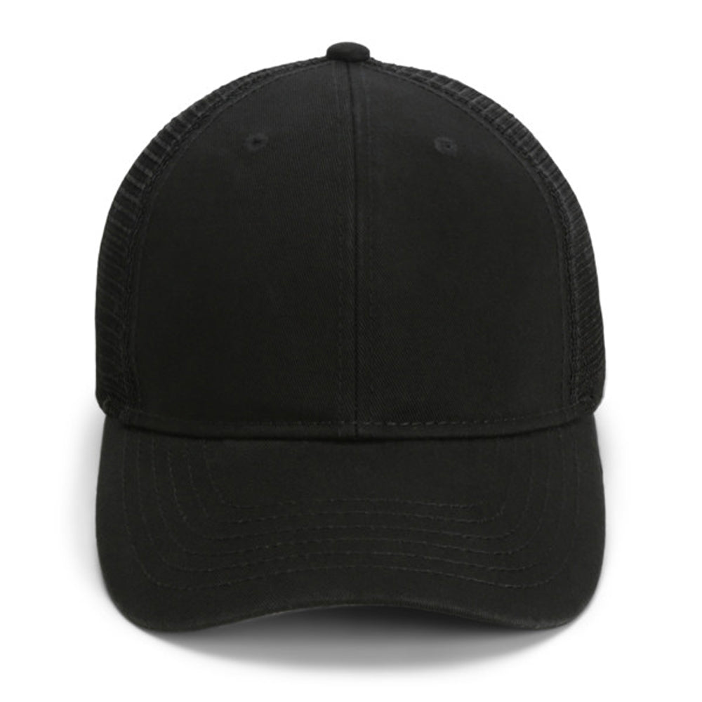 - Garment washed cotton twill front and ultra-soft polyester mesh back