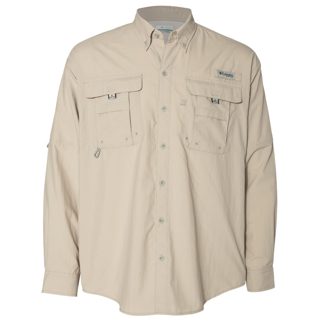 Dress up your look with a custom Columbia Men's Fossil PFG Bahama Long Sleeve Shirt. This stylish button-down is also durable and has Tactel nylon and sun protection. Whether you are heading out fishing in at the lake and need the built-in rod holder or looking for something that is tough for the jobsite, this is the best choice.This product cannot ship outside of the United States.