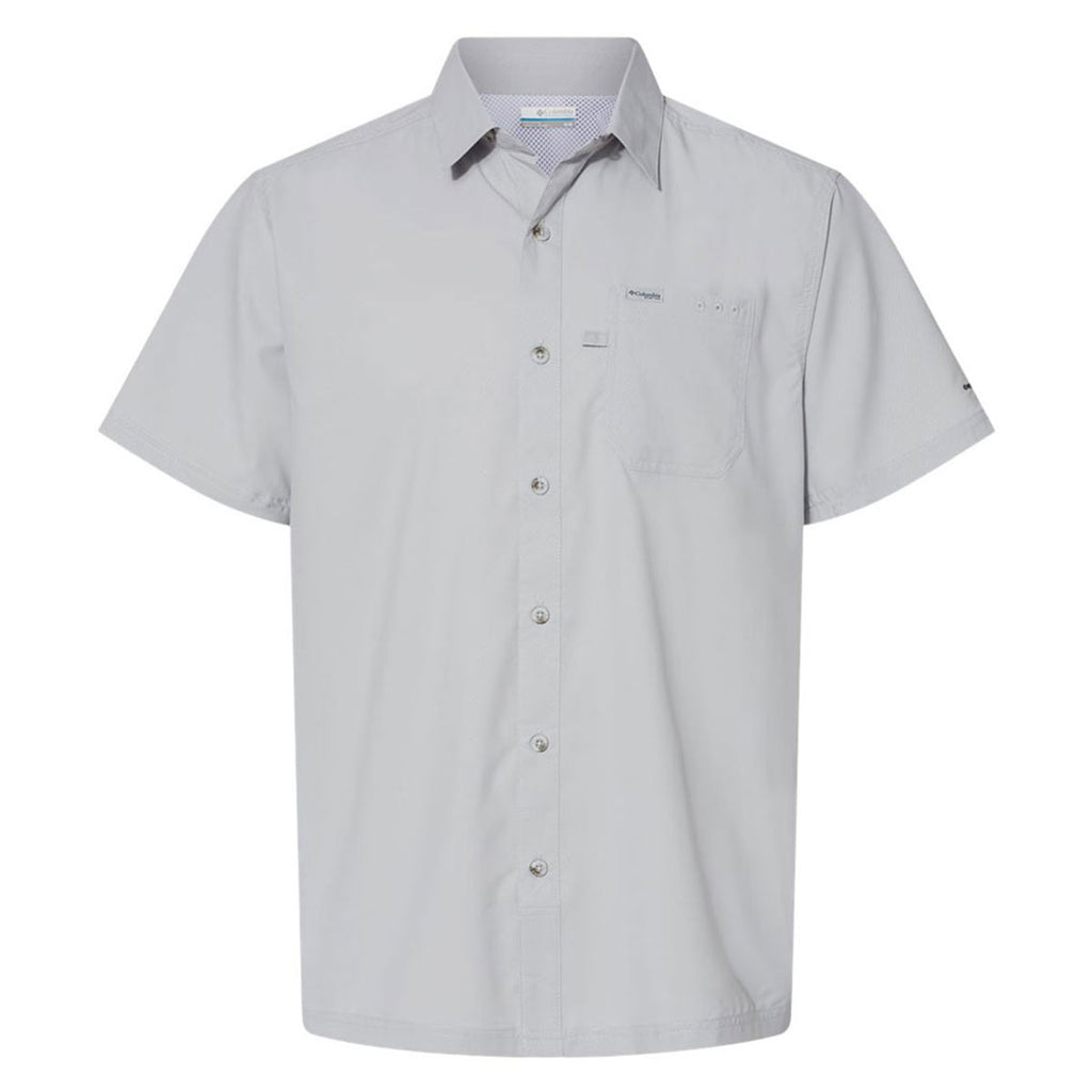 Relax and unwind in a custom Columbia Men's Cool Grey Slack Tide Camp Shirt with Omni-Shade UPF 50 sun protection and Omni-Wick technology. This short sleeve button-up is vented and has a sunglass cleaning patch for convenience as you enjoy the great outdoors. Add a company logo to use this highly functional shirt as employee apparel or a custom logo to create team or organizational gear that most will appreciate. The ease and comfort of this camp shirt makes you want to relax, unwind, and enjoy the outdoors.
