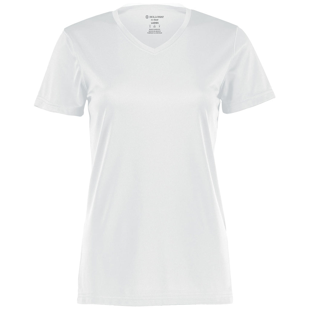 Custom screen print will pop on the Holloway Women's White Momentum Tee. This simple, straightforward tee is a must have as daily comfort wear that can be dressed up or down as needed. A basic tee is a wardrobe staple that can serve many purposes. Add a company logo to use as part of a uniform or a custom design to show affiliation with a group, club, or team. The feminine fitting tee is color secure, wicks moisture, and is odor resistant with V-neck collar and set-in sleeves. The possibilities are endless with this tee, so place your order right away.Corresponding Men's Style: Holloway Men's White Momentum Tee